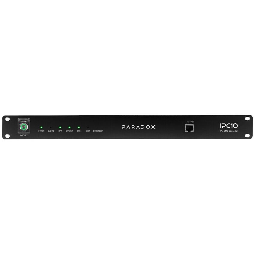 IPC10 este un convertor/receptor IP care preia date Ethernet de la sistemele Paradox și le transformă din protocolul IP criptat Paradox în format CID, compatibil cu protocoalele Sur-Gard MLR2-DG sau Ademco 685, pentru transmiterea către software-ul stației centrale de monitorizare (CMS). Compact, cu consum redus de energie și buffer de până la 10.000 de evenimente, permite monitorizarea eficientă a mii de conturi simultan, oferind conectivitate sigură și fiabilă prin PoE.