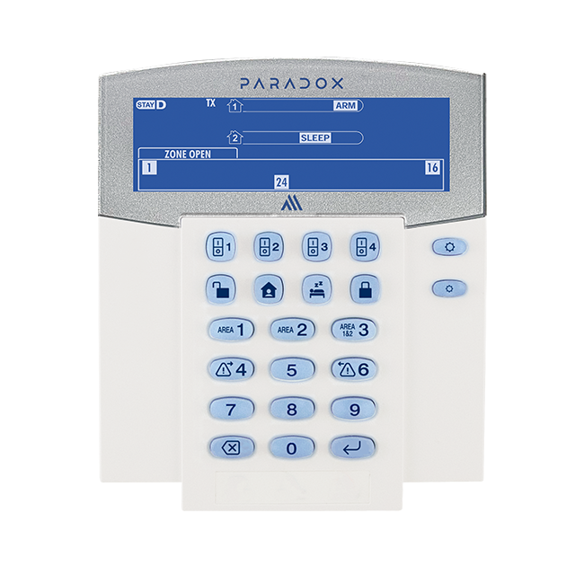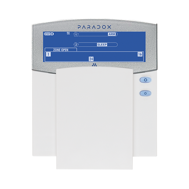 K38M este o tastatură LCD wireless pentru 32 de zone și 2 partiții, cu afișaj intuitiv cu pictograme și iluminare nocturnă. Dispune de comunicație securizată bidirecțională GFSK la 868 MHz, autonomie a bateriei de până la 5 ani și funcții suplimentare precum control PGM și buton de panică, fiind ideală pentru monitorizarea și controlul sistemelor Paradox M25.